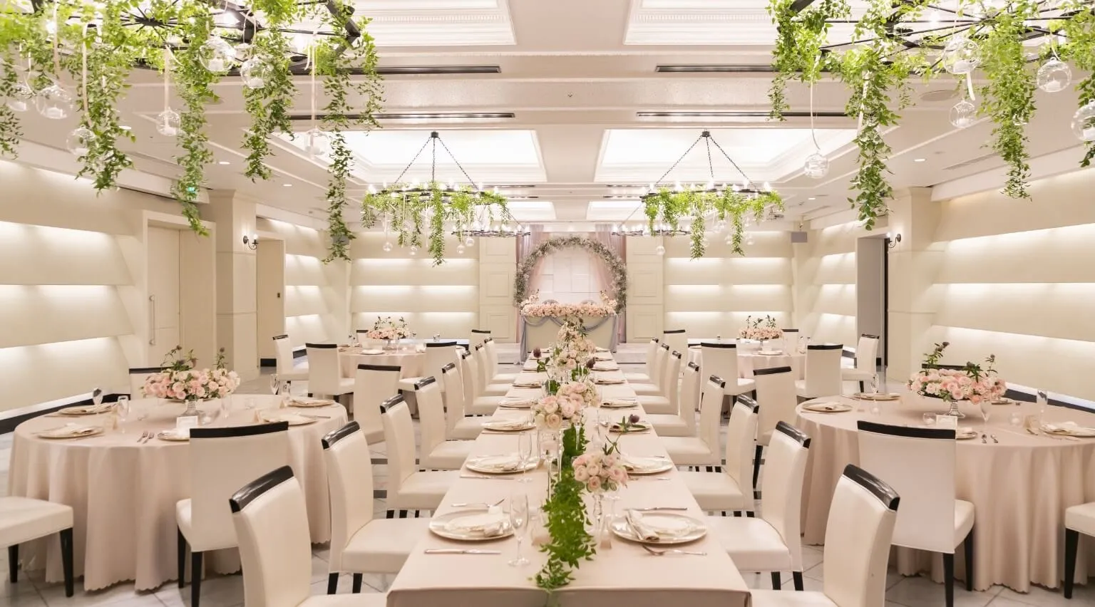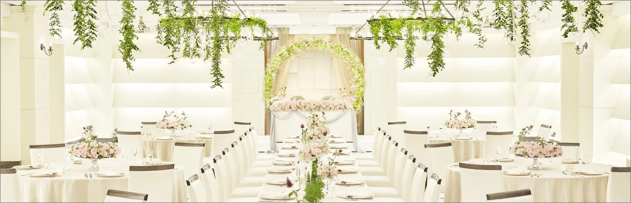ノーブルホワイトをテーマにしたメインバンケットホール ザ・ロイヤルは、すべてのウエディングシーンを優美に輝かせるプレミアムな舞台です。