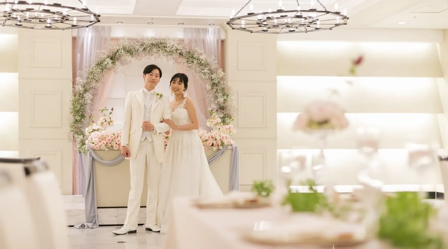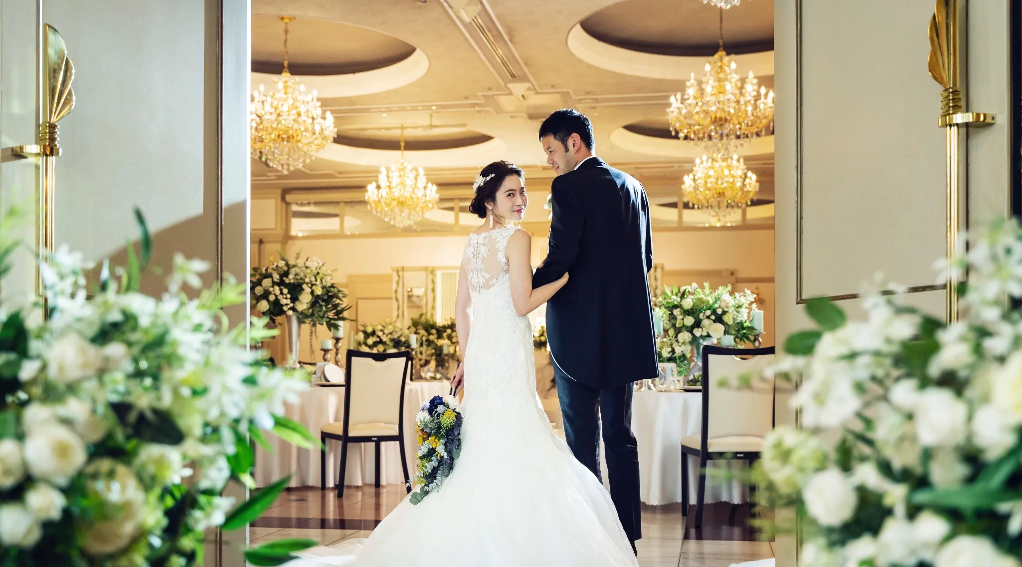 煌めくシャンデリア、7mの天井高、オフホワイトでコーディネートされた大理石の床と壁面。ノーブルホワイトをテーマにしたメインバンケットホール ザ・ロイヤルは、すべてのウエディングシーンを優美に輝かせるプレミアムな舞台です。おふたりでテーブル席をまわるその姿にも、きっとプリンセスのような誇りが漂うに違いありません。